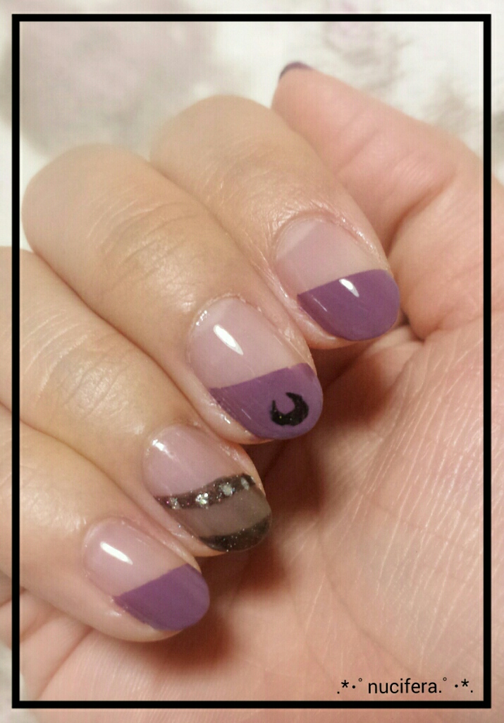 紫の斜めフレンチ部分にブラックムーンのマークを手描き。